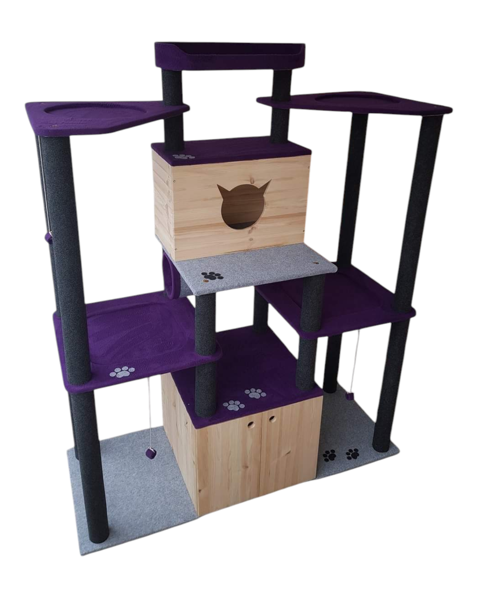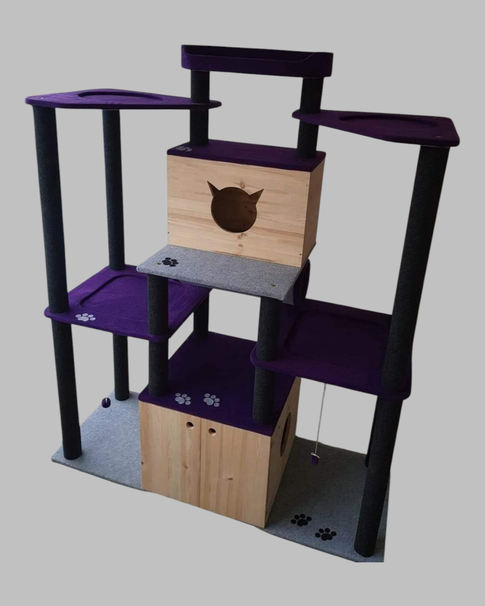 - spacious, comfortable lounge chairs and a bed on top, for four or more cats, covered with soft, tufted fabric